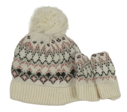 2set - Smetanovo-ružová vzorovaná čapica s bambulí + rukavice Tu