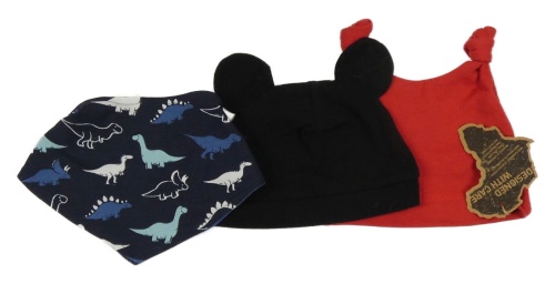 • Nové - 3set - Červená čepice + černá čepice + tmavomodrý slinták s dinosaurami