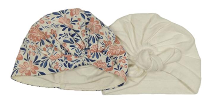 2x bavlněná turbanová čepice - smotanová s mašlí + kvetovaná s mašlou