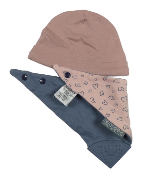 2set - pudrová čepice + růžový slinták so srdiečkami a kousátkem