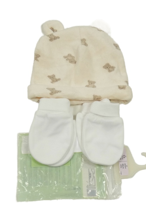 3set - 1x Broskvová zamatová čapica s medvídky + 2x bílé rukavice
