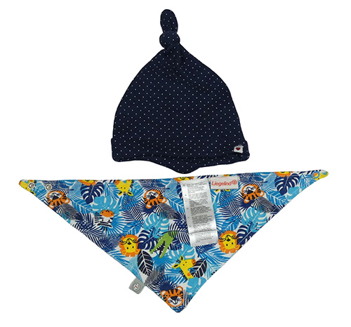 • 2set - Tmavomodrá puntíkatá bavlněná čepice + bílo-modrý slinták s listami a zvířaty