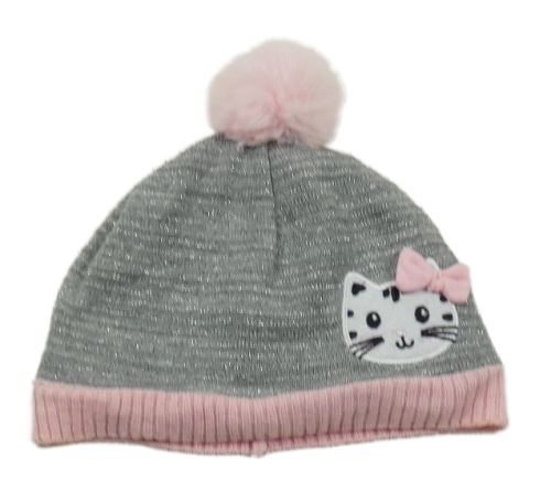 Sivo-ružová pletená čapica s mačkou a brmbolcom