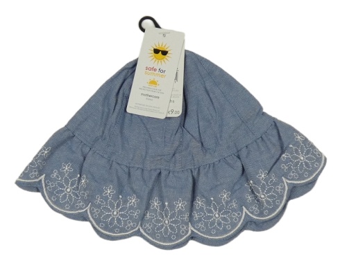 Nové - modrý ľahký rifľový klobúk s výšivkami Mothercare