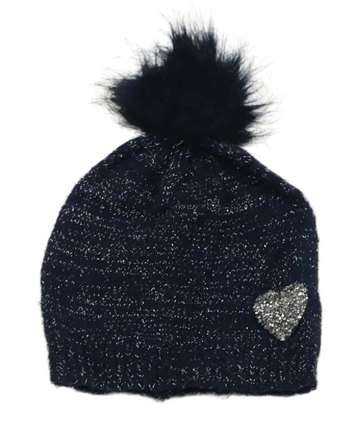 Tmavomodrá trblietavá pletená čapica so srdcem a brmbolcom