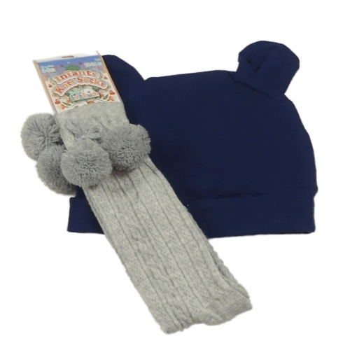 2set - Tmavomodrá bavlnená čapica s oušky + šedé melírované vzorované podkolenky s bambulemi