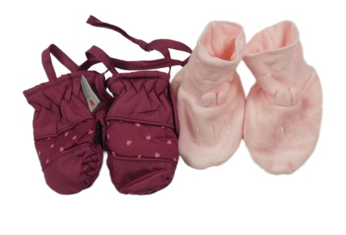 bačkory - bavlna + polyester, protiskluzová podrážka, rukavice - polyester + polypropylen, vel. 86-92 cm