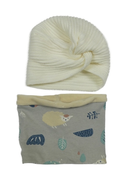 2set - Smetanová pletená čepice + šedý nákrčník s ovečkami