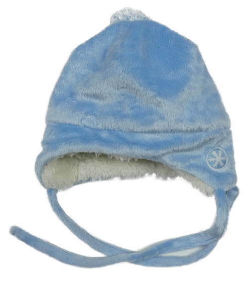 Modrá plyšová zateplená zavazovací čapica s vločkou a brmbolcom