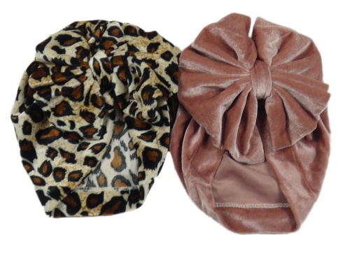 2x - Turbanová zamatová čapica s mašlí - Béžovo/hnědo/černá vzorovaná, staroružová