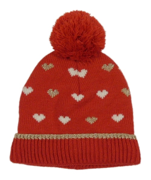 Červená pletená podšitá čapica so srdiečkami a brmbolcom