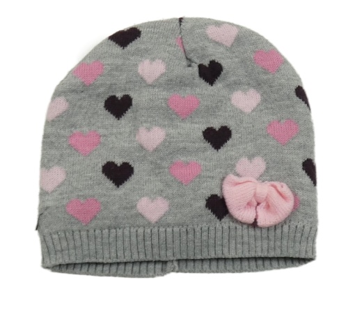 Sivá pletená čapica so srdiečkami a mašlou
