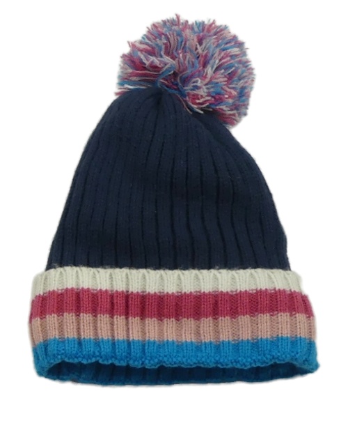 Tmavomodrá pletená čapica s růžovo-modrým pruhovaným lemem a brmbolcom