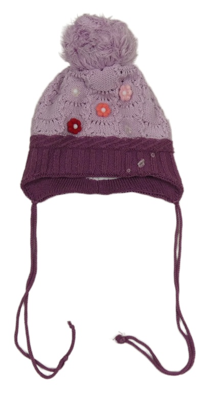 Lila-fialová pletená čapica s kvítky a brmbolcom