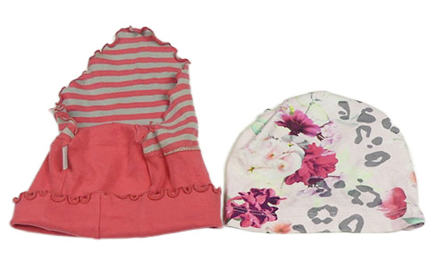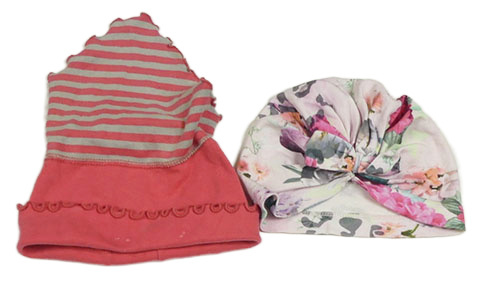 2Set - Jahodovo-sivý pruhovaný šátek/čepice + svetloružová turbanová čapica s kvietkami a vzorom