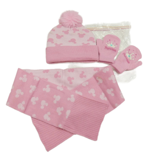 Nové - 3Set - Svetloružová -ružová čapica s Mickey a bambulí + šála + palcové rukavice s korunkou Disney