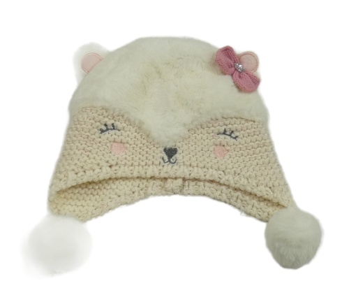 Bielo-smotanová kožešinovo/pletená čapica so zvieratkom