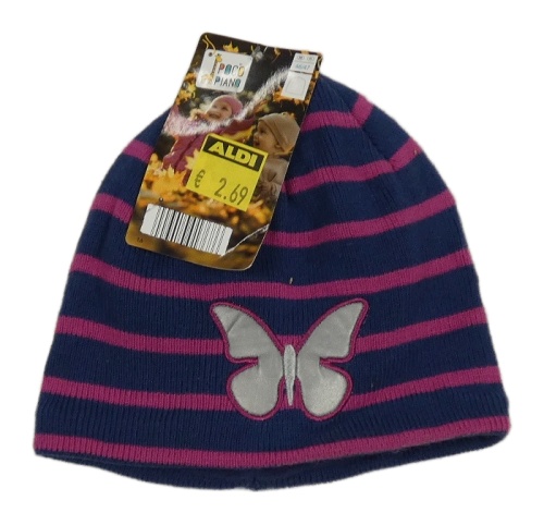 Nové - tmavomodro/růžová pruhovaná pletená čapica s motýlkom POCOPIANO