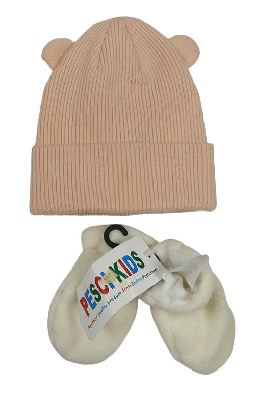 2set - Ružová rebrovaná čapica s oušky + smetanové fleecové rukavice