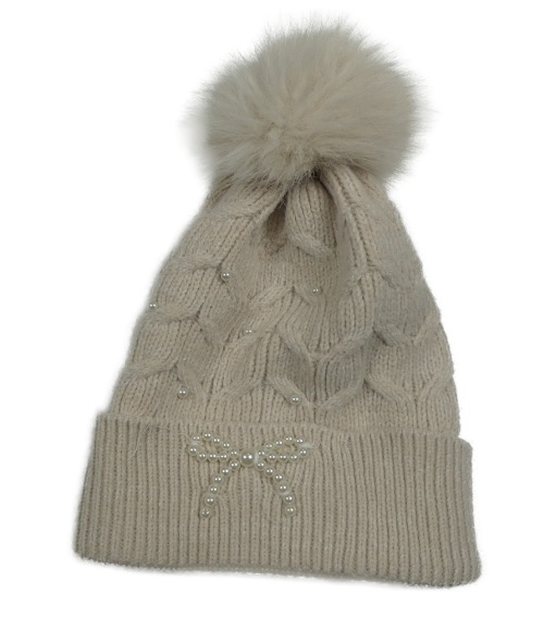Svetlobéžová vzorovaná pletená čapica s perličkami a brmbolcom