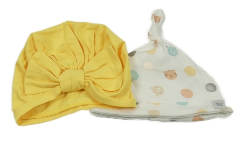 2x bavlněná čepice - žlutá turbanová s mašlí + smetanová bodkovaná so zvířaty