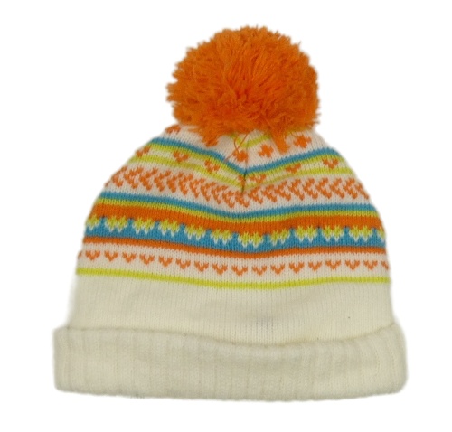Smetanovo-oranžovo-modro-zelená vzorovaná čapica s brmbolcom