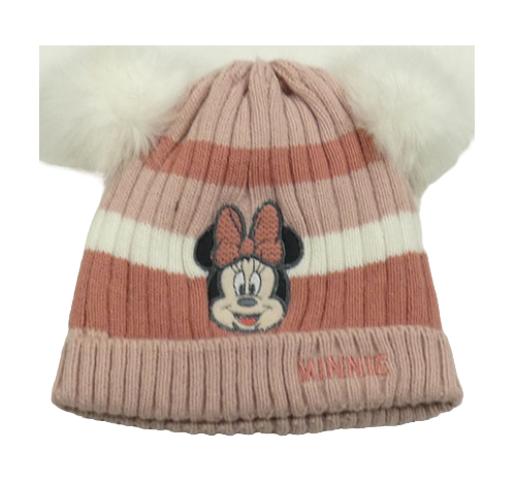 Staroružová pruhovaná rebrovaná pletená čapica s Minnie a bambulemi C&A