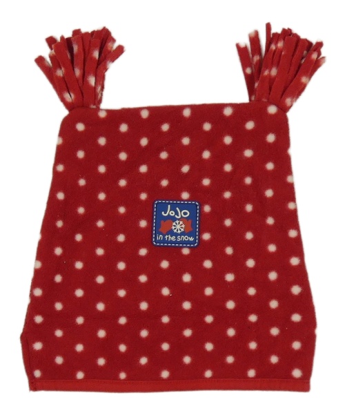Červená fleecová čapica s bodkami a nášivkou