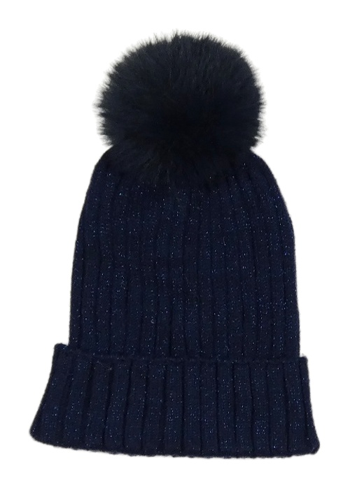 Tmavomodrá pletená trblietavá čapica s brmbolcom