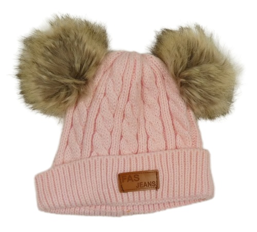 Ružová pletená čapica s nášivkou a bambulemi