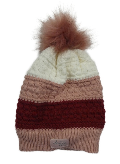 Nové - Ružovo-vínovo-biela pruhovaná pletená podšitá čapica s brmbolcom