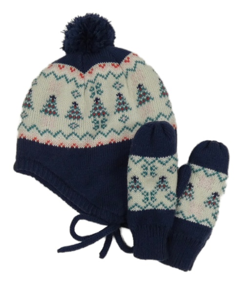 2 set - tmavomodro-biela vzorovaná pletená čapica s bambulí + palcové rukavice