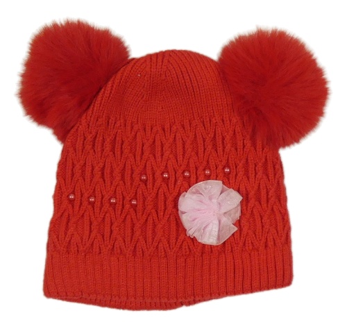 Červená vzorovaná čapica s perličkami a bambulkami