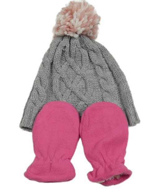 2set - Šedá pletená vzorovaná čepice + růžové fleecové rukavice