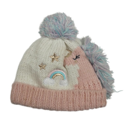 Smetanovo-svetloružová pletená čapica s jednorožcom a brmbolcom