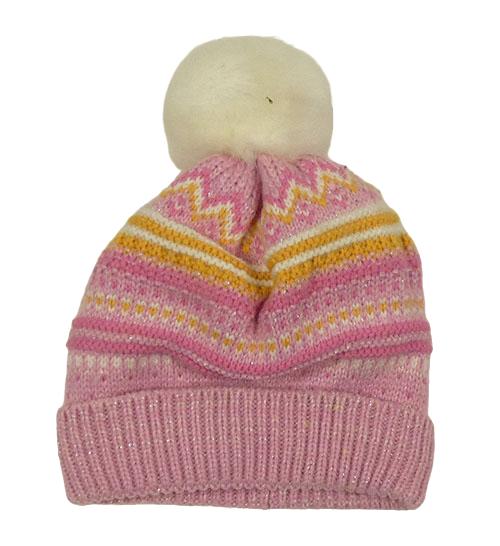 Ružovo-žlto-biela vzorovaná trblietavá pletená čapica s brmbolcom