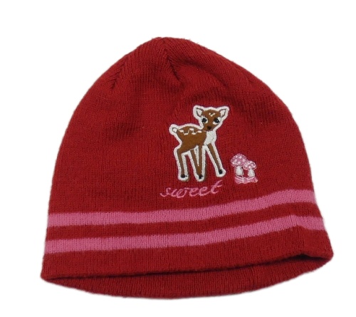 Červená pletená čapica so srnkou a muchomůrkami a pruhmi