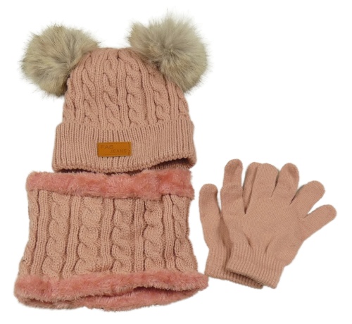 3set - Staroružová pletená čapica s bambulemi + nákrčník + prstové rukavice