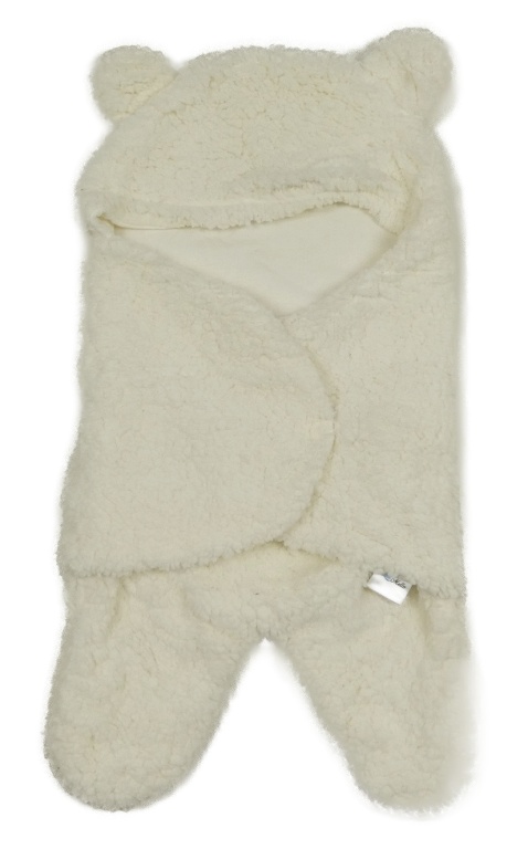 Bílý huňatý zavinovací fusak do autosedačky s kapucňou
