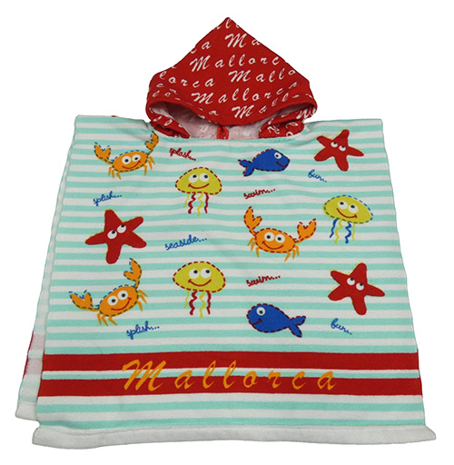 • Tyrkysovo-bielo-červené froté osuškové pončo s mořskými živočichy a kapucňou