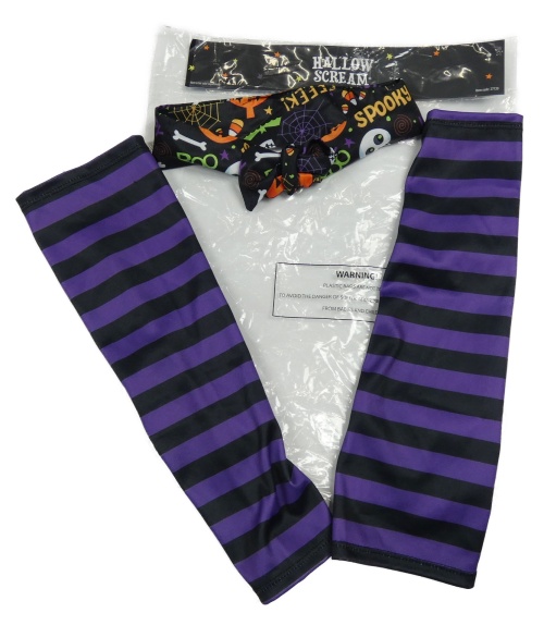 Nové - 2 set - čierna čelenka s dýněmi + černo-fialové pruhované návleky