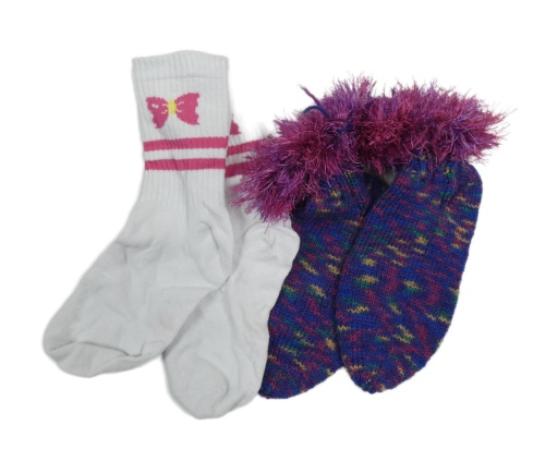 • 2x - Ponožky - Bílé s motýlkom a pruhy vel. 31-34, barevné pletené s chlupatým kanýrkem