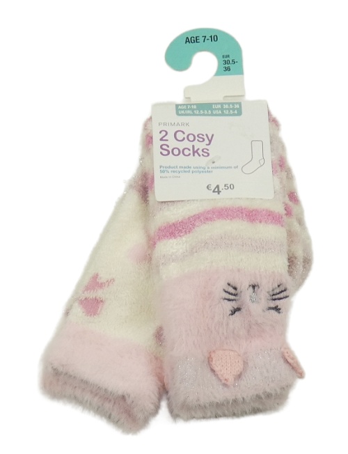 Nové - 2x chlupaté ponožky - růžovo-smetanové pruhované s kočkou + smetanové s mašľami