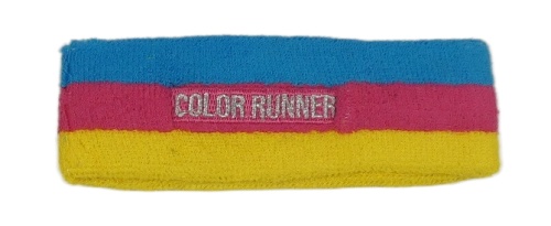 Modro-tmavorůžovo-žltá pruhovaná froté športová čelenka s nápisom