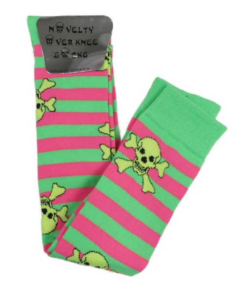 Nové - Neonově zeleno-žluté pruhované nadkolenky s lebkami vel. 31-34