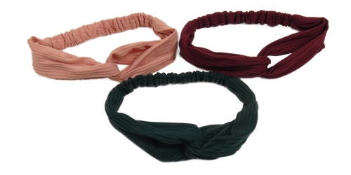 3x rebrovaná látková čelenka s uzlem - růžová + vínová + tmavozelená