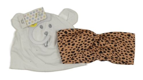Nové - 2set - Biela čapica s oušky + broskvovo-čierna vzorovaná čelenka F&F