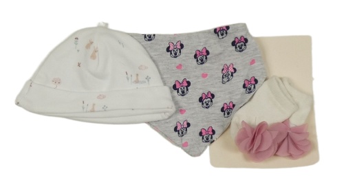 Nové - 3set - Biela čapica s kytičkami + šedý slintáky s Minnií + biele ponožky s kvetmi