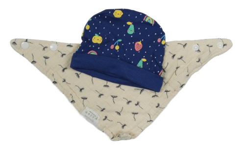 2 set - modrá čapica s ovocem + smetanový slinták so vzorom