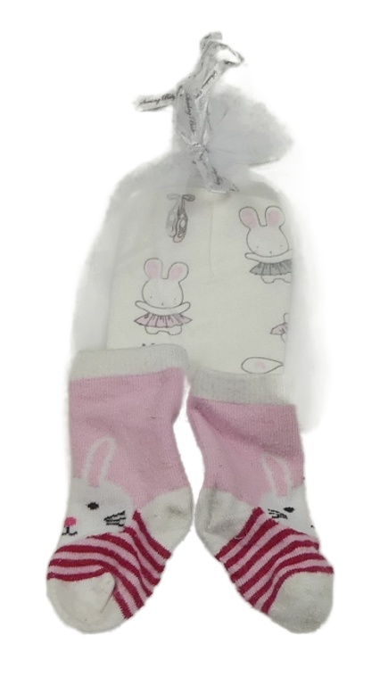 • Nové - 2set - bílá čepička s králíčky + bielo-ružové pruhované ponožky s králíčky